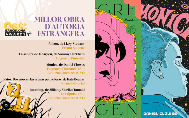 Ahí están esos dos pepinos que publicamos el año pasado, «La sangre de la virgen» y «Monica», de Harkham y Clowes, respectivamente, nominados en el Salón del cómic de Barcelona.