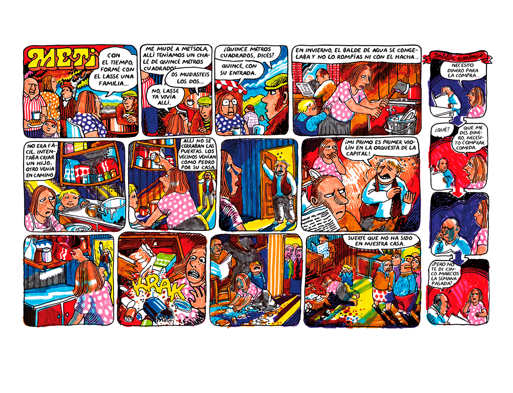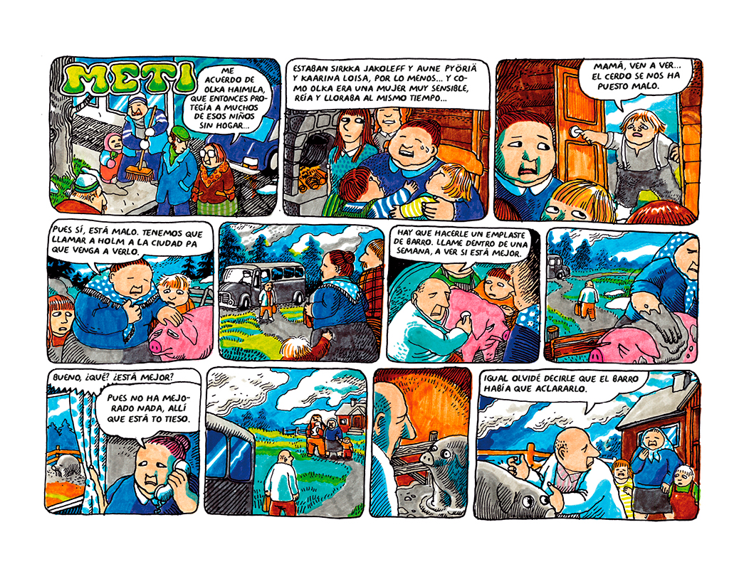 La abuela Meti es un clásico moderno del cómic finlandés y uno de los títulos más alabados y queridos de Aapo Rapi. En sus páginas se aúnan un trazo personalísimo y vital con reminiscencias del underground norteamericano —el lápiz grueso y el color saturado— con la sensibilidad de alguien para quien hacer cómics es una tabla de salvación. El autor describe en este libro su propia situación vital a mediados de los 2000 —caracterizada por la inestabilidad laboral y una peligrosa deriva etílica— paralelamente a los encuentros que mantiene con su abuela Meeri, ya octogenaria y retirada del mundanal ruido, quien le relata, siempre con humor, historias de una vida marcada por la miseria y la incomunicación. El libro se convierte así en una historia no oficial de Finlandia, contada desde el punto de vista de los desfavorecidos y los iletrados.
